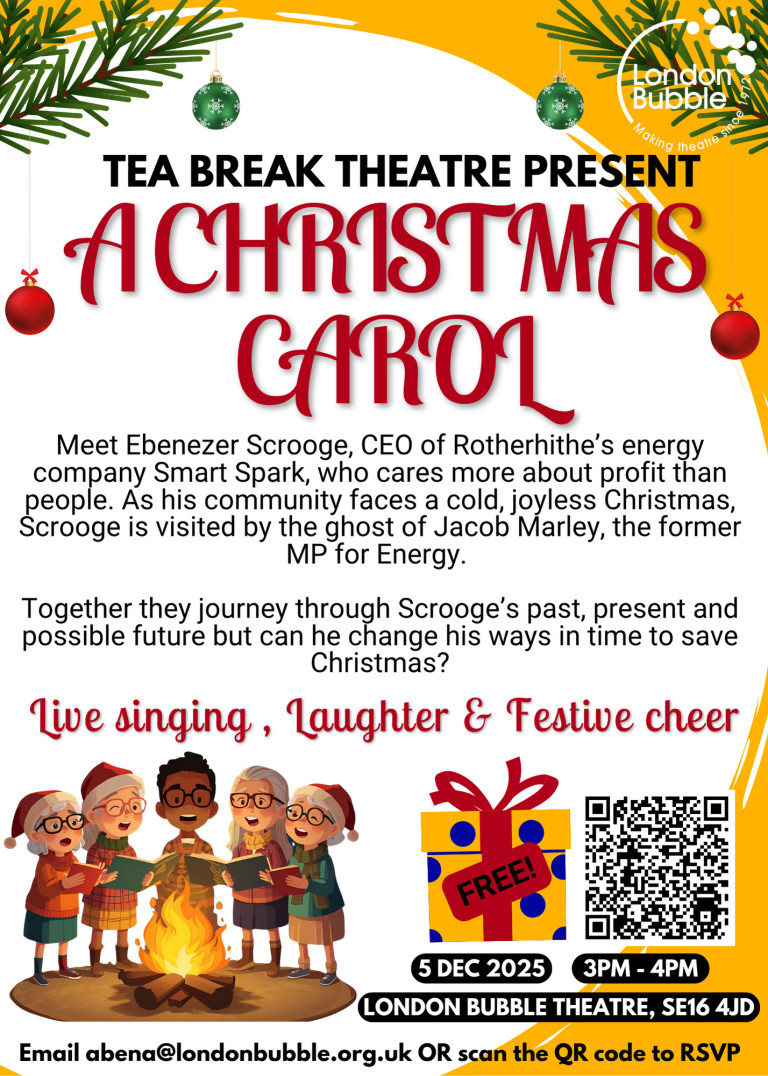 Meet Ebenezer Scrooge, CEO of Rotherhithe’s energy company Smart Spark, who cares more about profit than people. As his community faces a cold, joyless Christmas, Scrooge is visited by the ghost of Jacob Marley, the former MP for Energy.